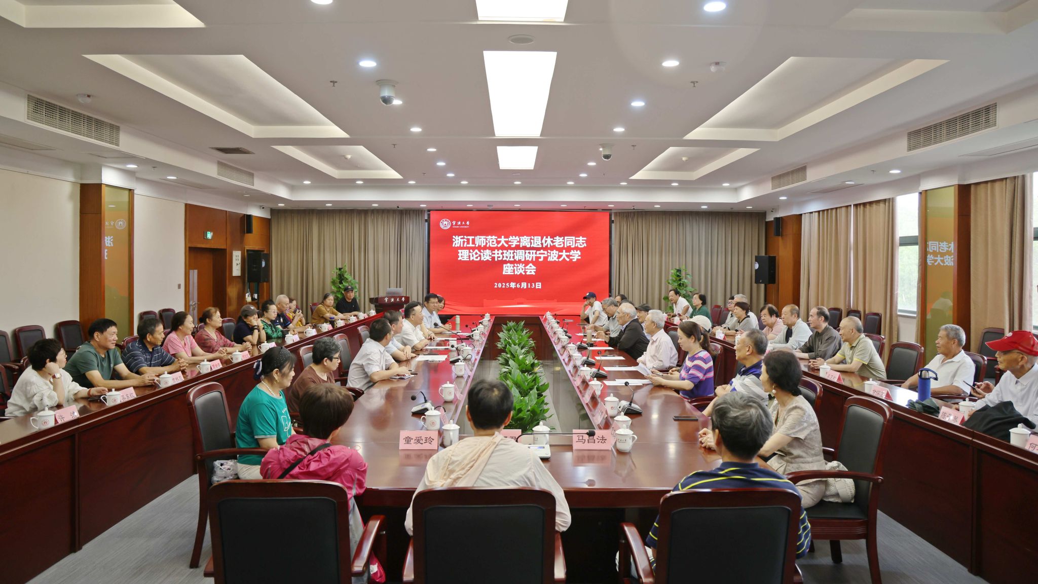 6月13日上午,浙江师范大学离退休老同志理论读书班莅临宁大调研交流,浙江省政协教科卫体委副主任、校原党委书记朱达出席并主持座谈,浙江师范大学原党委书记毛华岳,我校党委副书记张真柱、关工委常务副主任冯志敏出席。